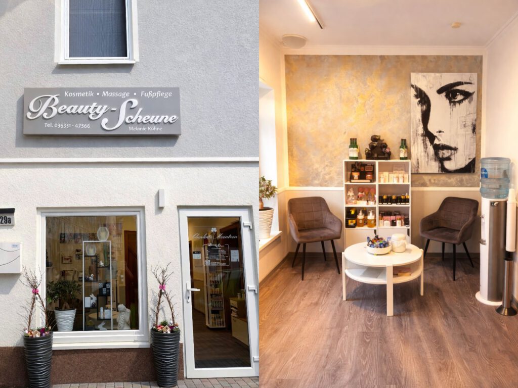 Das Leistungsangebot der Beauty-Scheune umfasst professionelle Kosmetikbehandlungen, Körpermassagen sowie Hand- und Fußpflege. Im Bereich Kosmetik stehen unter anderem die klassische Beautybehandlung (ca. 1,5 Stunden, 53,50 €), die Grundbehandlung oder Aknebehandlung (ca. 1 Stunde, 40,50 €), Kosmetik für den Herrn (ca. 1,5 Stunden, 50,50 €) sowie die Beautybehandlung „Deluxe“ mit kleinem Tages-Make-up (ca. 2 Stunden, 68,50 €) zur Wahl. Ergänzt wird das Angebot durch Spezialbehandlungen wie die entspannende Gesichtsmassage (ca. 30 Minuten, 31,50 €), eine Rückenbehandlung mit Packung (ca. 1,5 Stunden, 47,50 €) sowie Wimpernverlängerung und -verdichtung (ab 44,00 €).