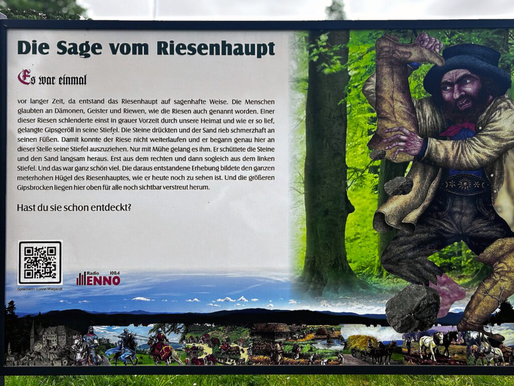 Ursprünglich soll sich auf der Anhöhe ein steinerner Wehrturm befunden haben. Heute stehen hier Bäume und das Riesenhaupt ist ein geschütztes Bodendenkmal. Laut einer Sage soll der Hügel auf einen Riesen zurückgehen. Auf seinem Weg in Richtung Norden drückte ihm etwas in seinem Schuh und er suchte einen Platz zum Ausruhen. Er setzte sich auf den Kohnstein und zog sich mühsam einen Stiefel vom Fuß. Da bemerkte er eine große Blase. Der Riese schüttelte seinen Stiefel und heraus fiel ein Sandkorn, das er wohl von der Adria mitgebracht haben musste. Als er den Stiefel wieder am Fuß hatte, trank er einen großen Schluck aus der Bere, die danach lange kein Wasser führte.